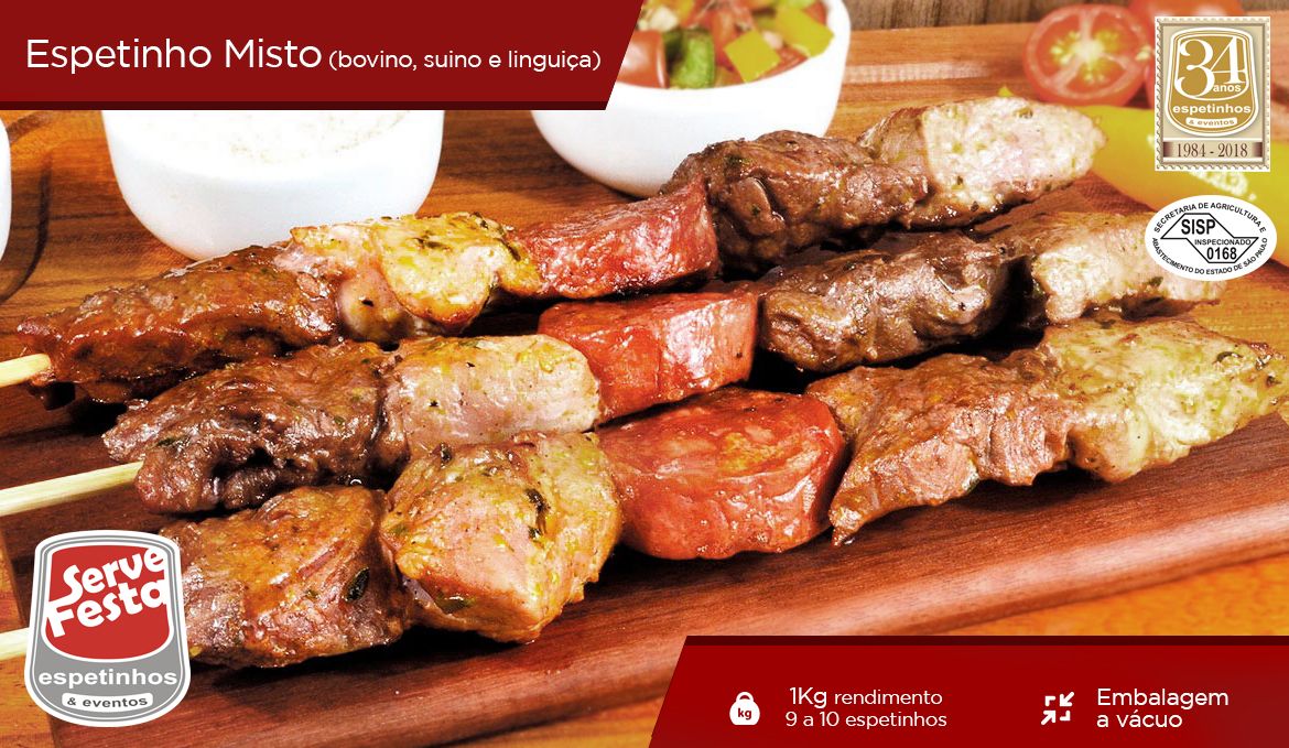 Carne suína, carne bovina e linguiça no espeto em embalagem a vácuo de 500g, prontinha para assar ou grelhar. A textura das carnes desse espeto proporciona excelente sabor e garante a sua completa e inigualável suculência. Prove e comprove.