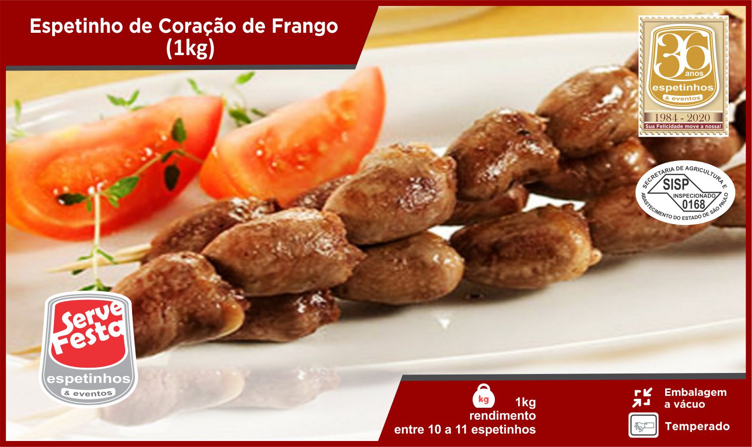 Coração de frango temperado no espeto em embalagem a vácuo de 500g, prontinha para assar ou grelhar. A textura do coração proporciona excelente sabor e garante a sua completa e inigualável suculência. Prove e comprove.