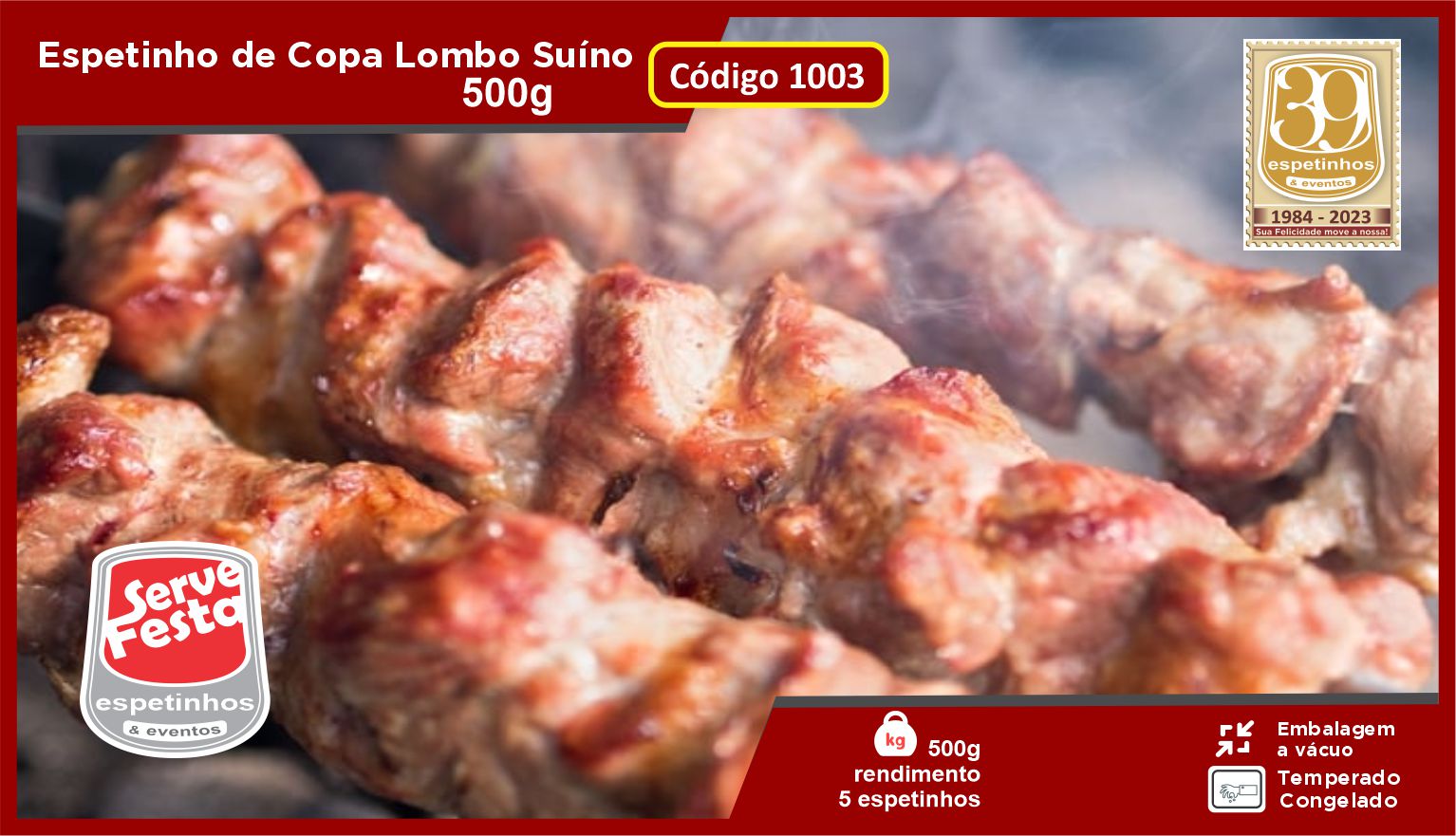 Carne Copa Lombo suíno temperada no espeto em embalagem a vácuo de 500g, prontinha para assar ou grelhar. A textura do Copa Lombo suíno proporciona excelente sabor e garante a sua completa e inigualável suculência. Prove e comprove.